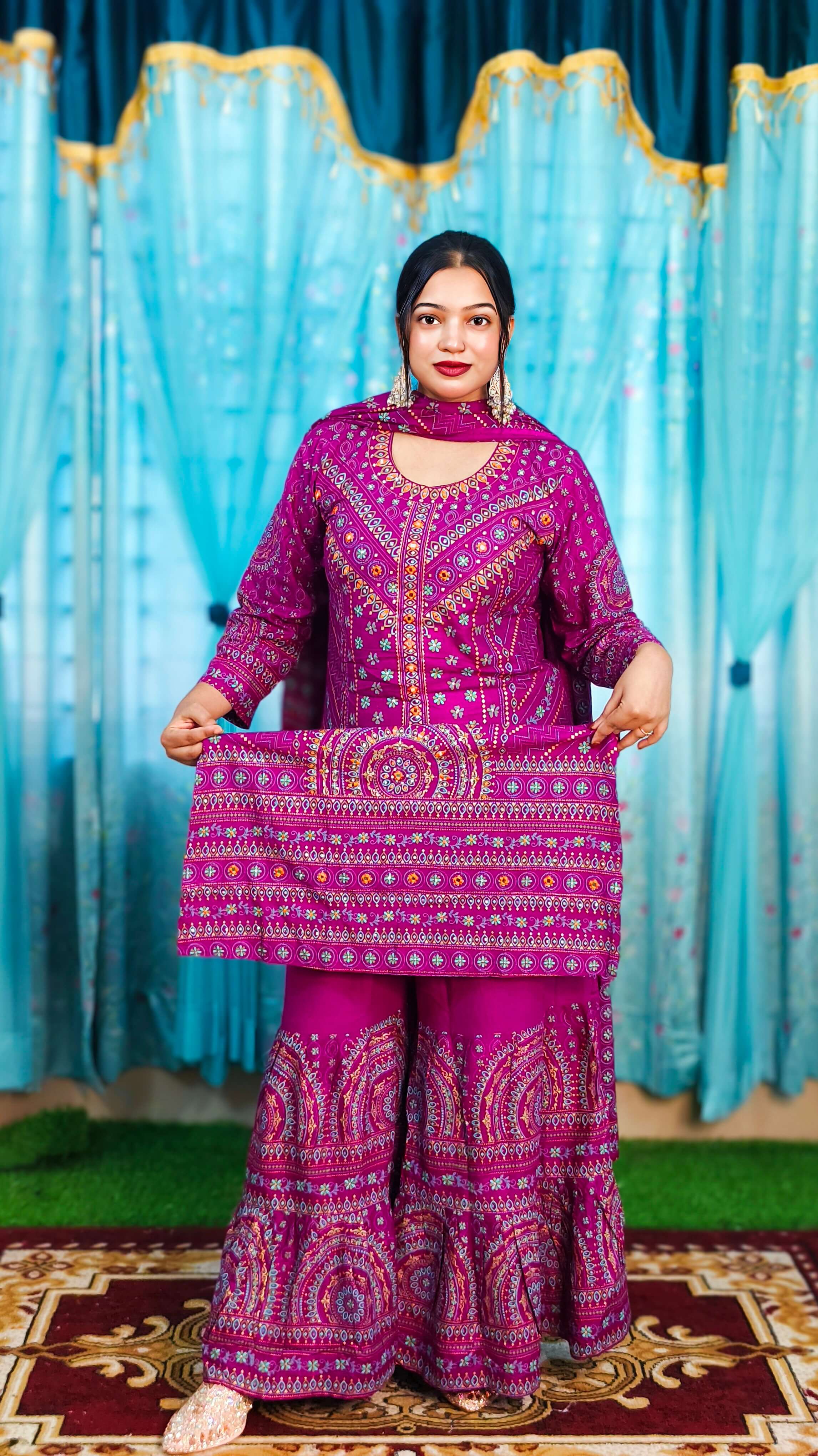 - অল ওভার স্ক্রিন প্রিন্ট এবং অল বডি মিরর এমব্রয়ডারি ও স্টোন ওয়ার্ক করা।