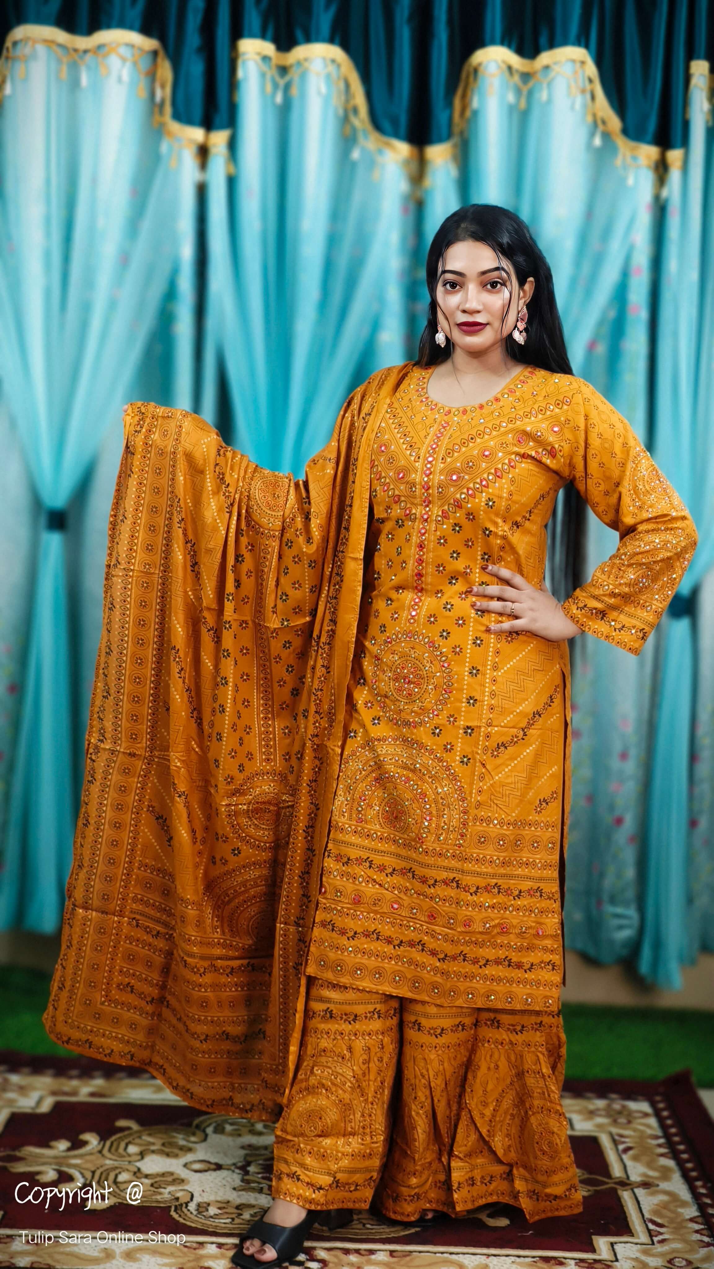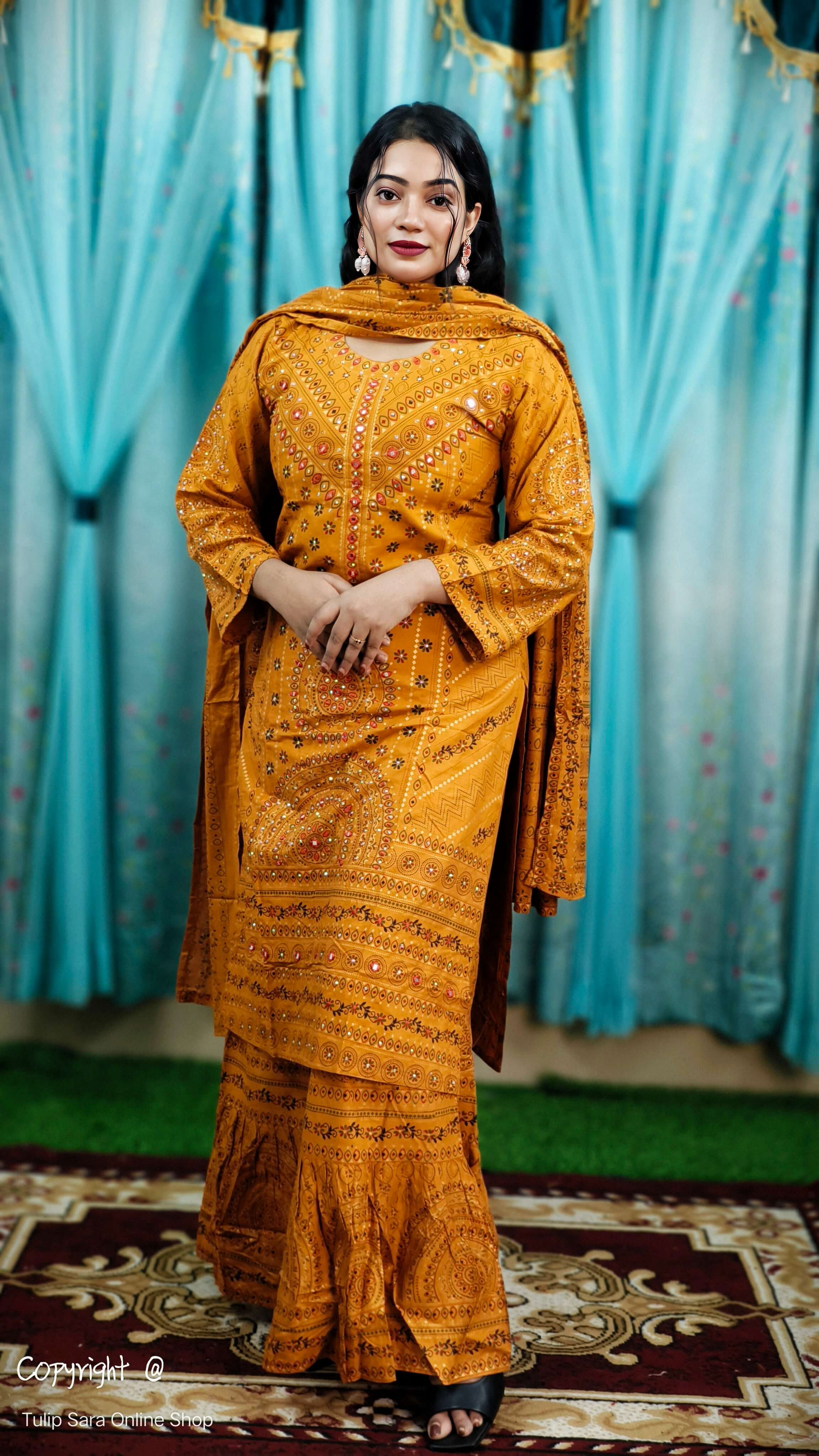 - অল ওভার স্ক্রিন প্রিন্ট এবং অল বডি মিরর এমব্রয়ডারি ও স্টোন ওয়ার্ক করা।