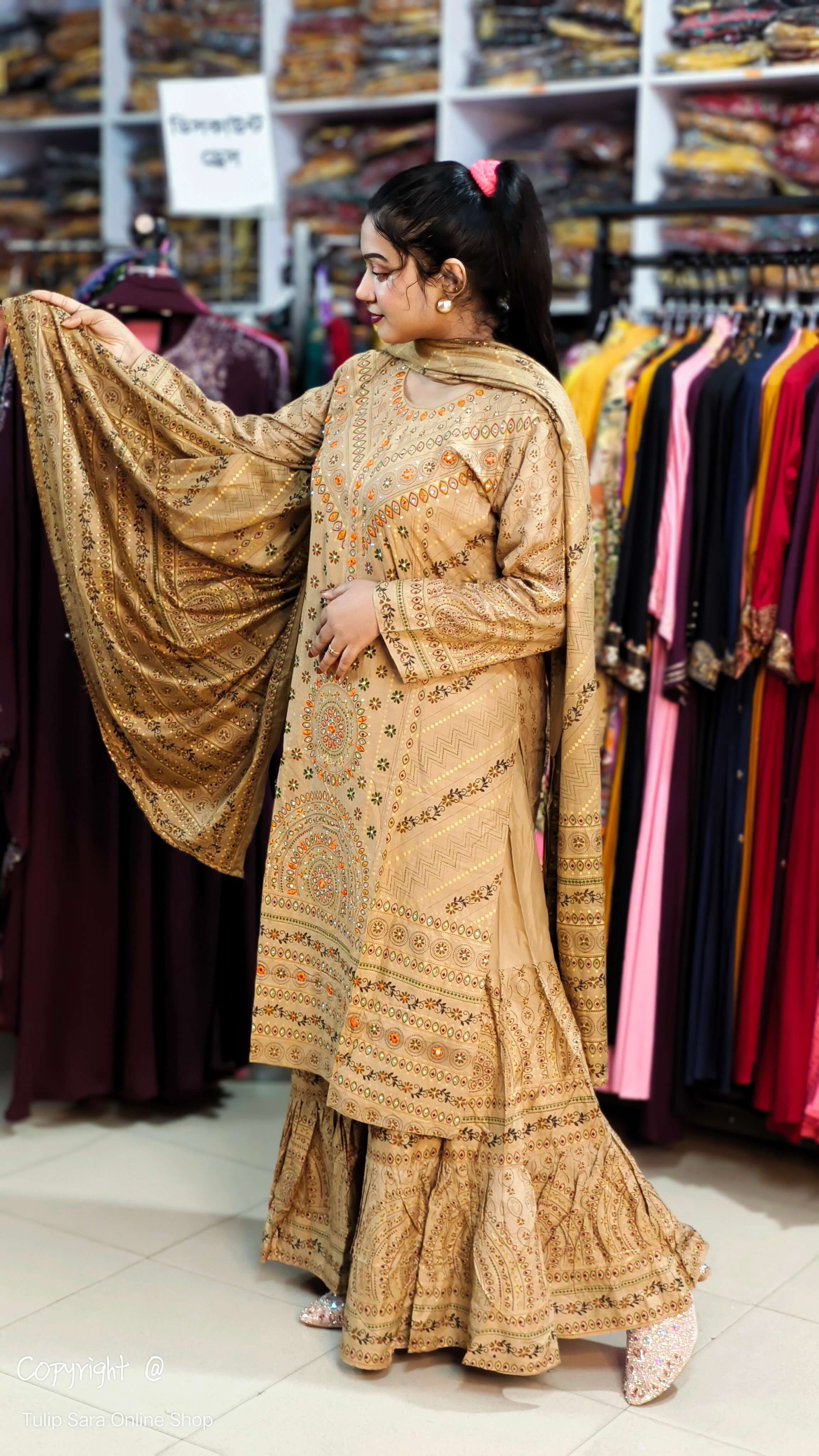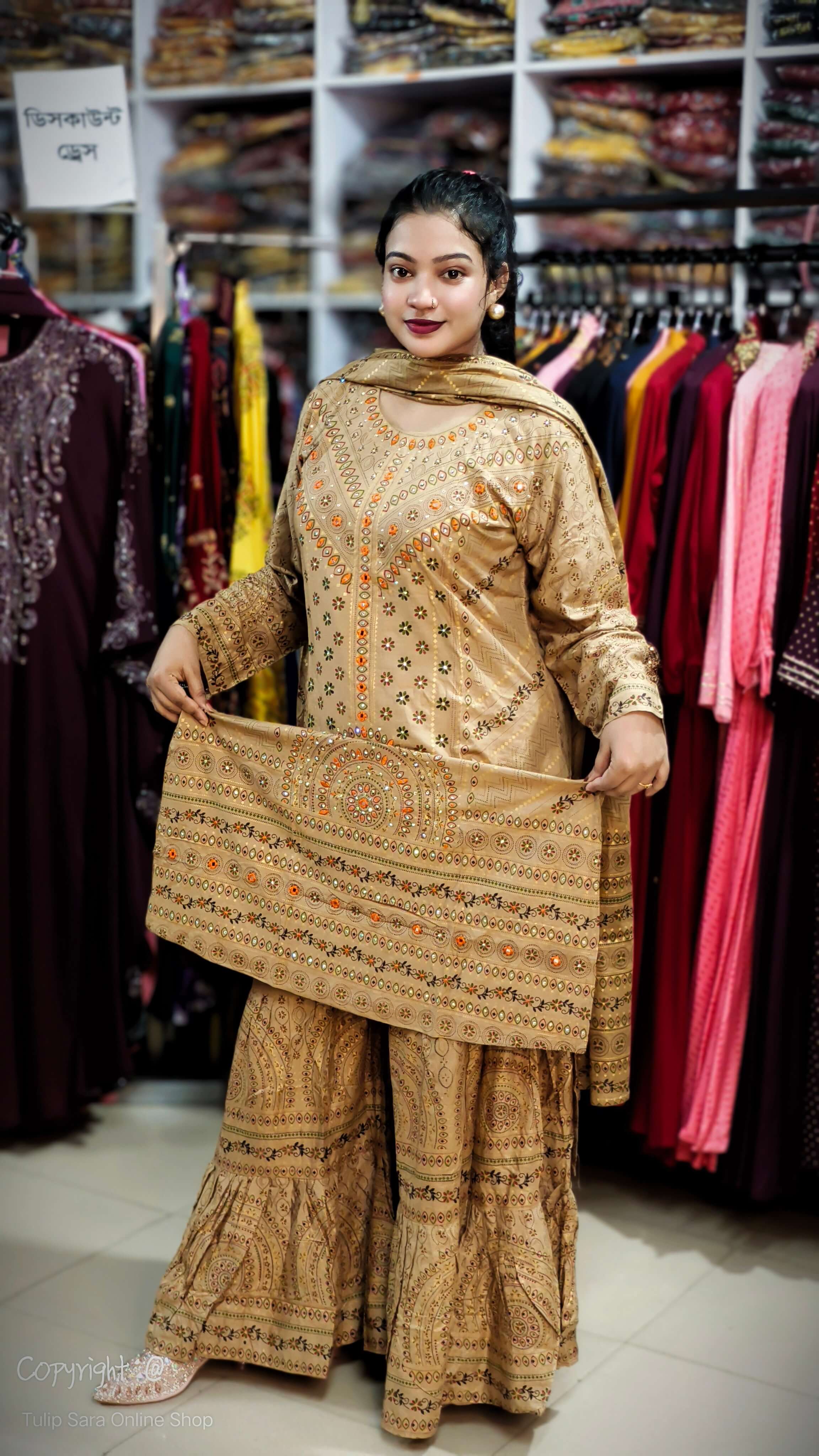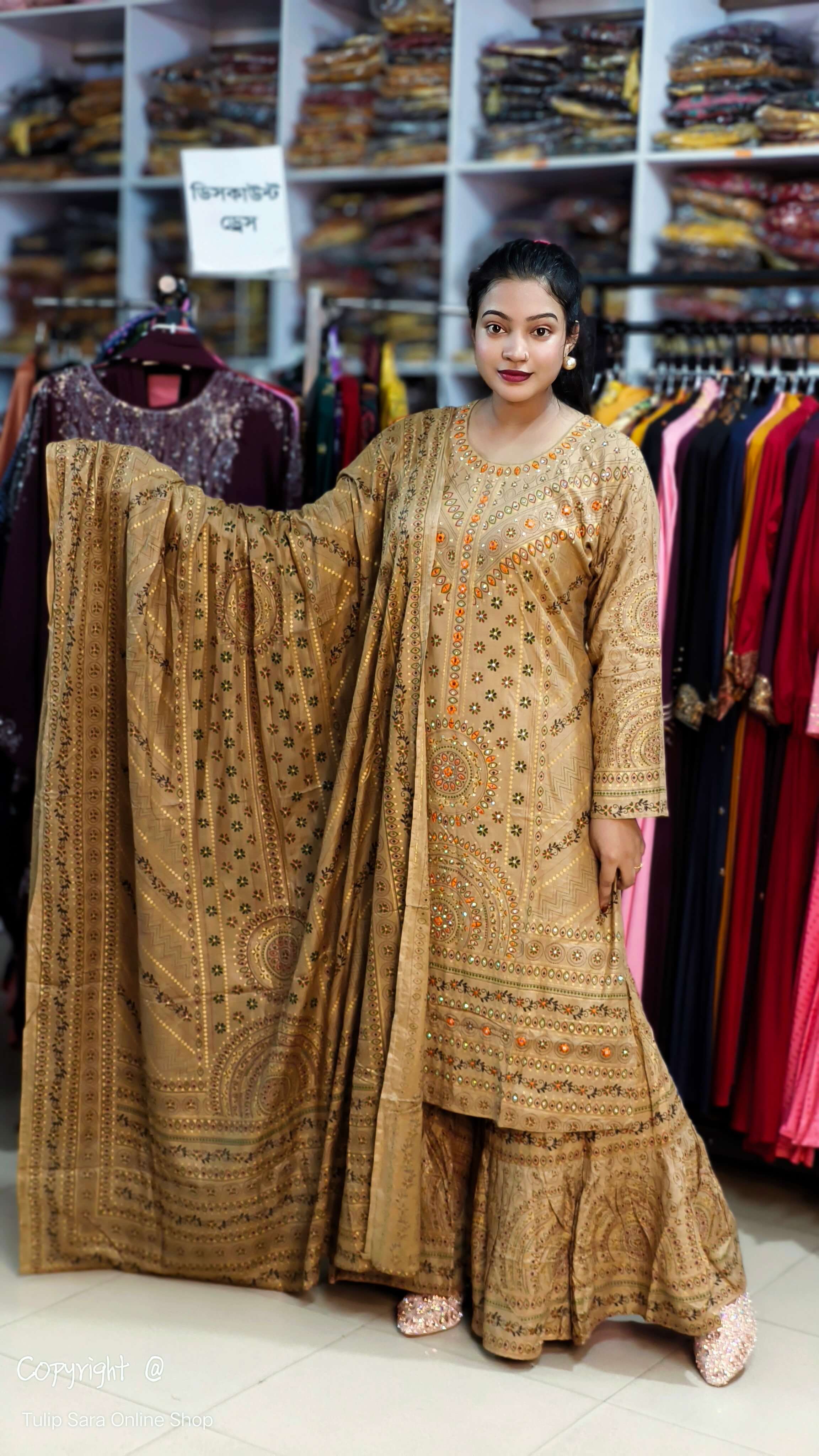 • অল ওভার স্ক্রিন প্রিন্ট এবং অল বডি মিরর এমব্রয়ডারি ও স্টোন ওয়ার্ক করা।