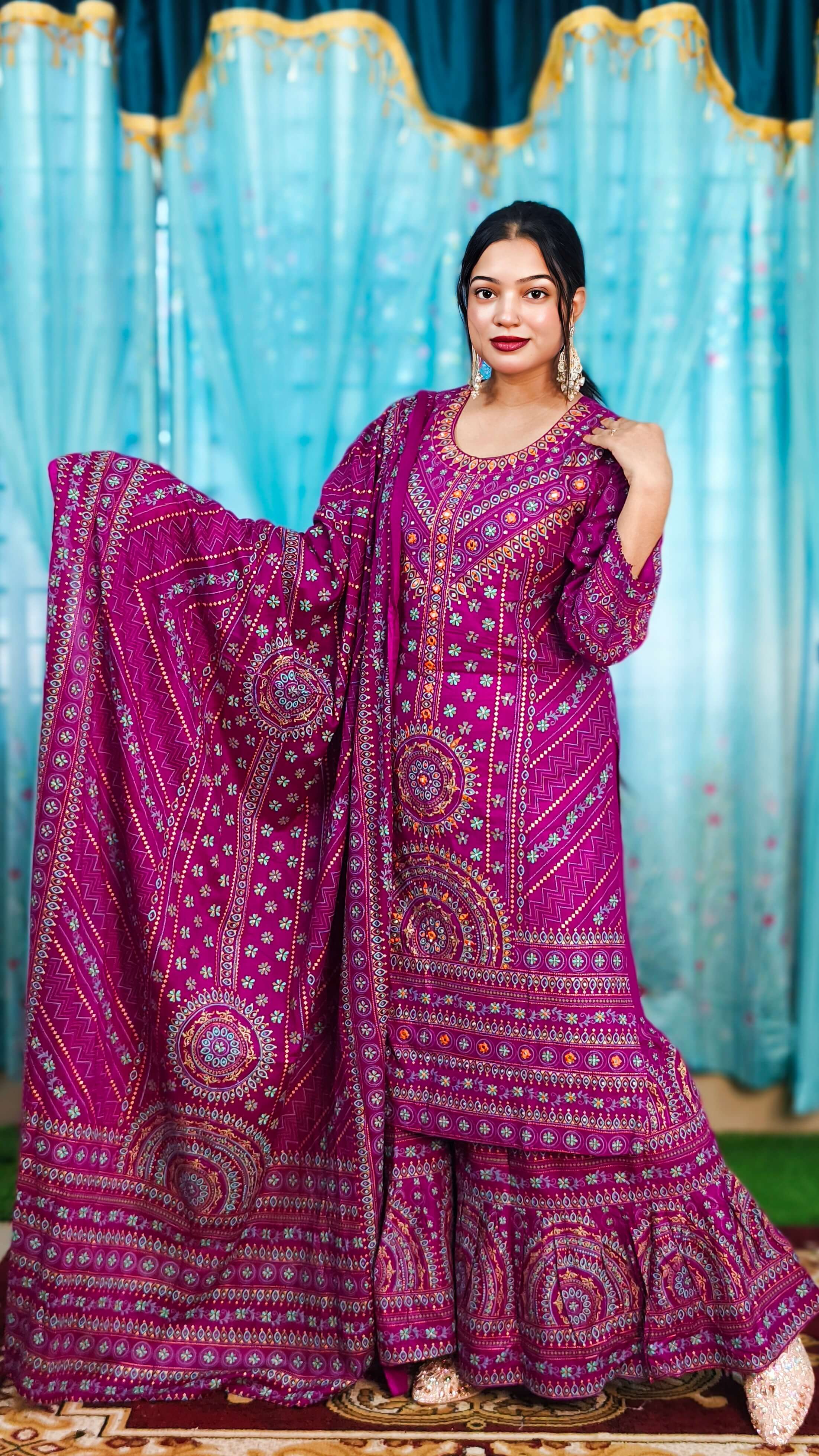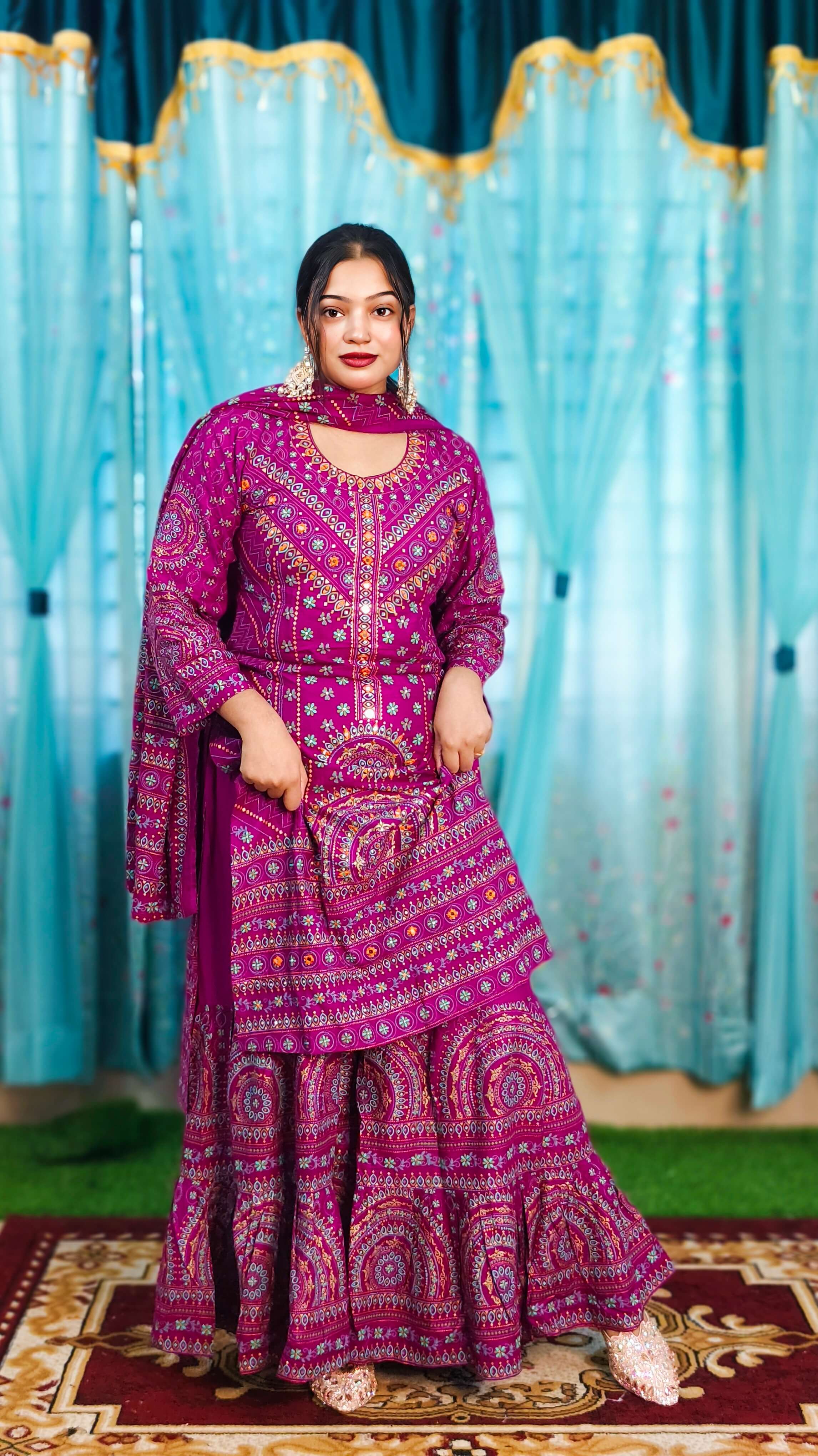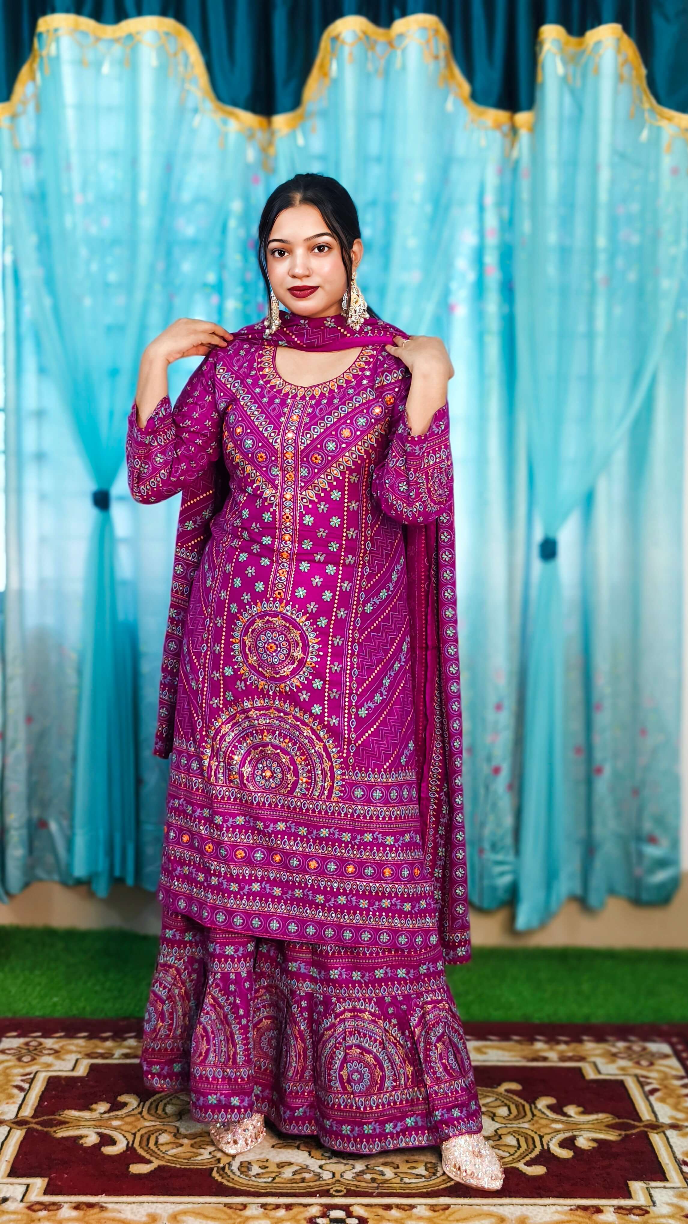 • অল ওভার স্ক্রিন প্রিন্ট এবং অল বডি মিরর এমব্রয়ডারি ও স্টোন ওয়ার্ক করা।
